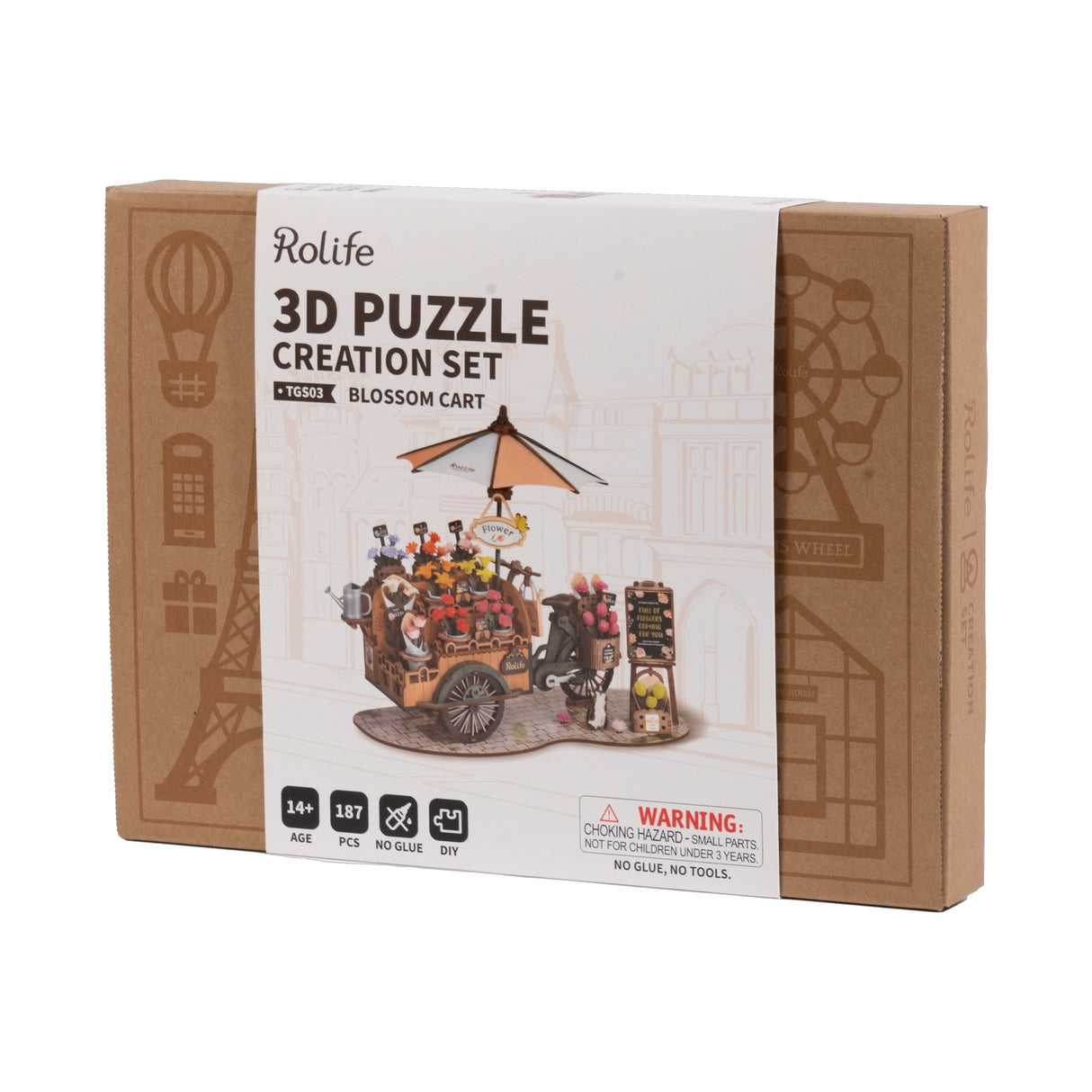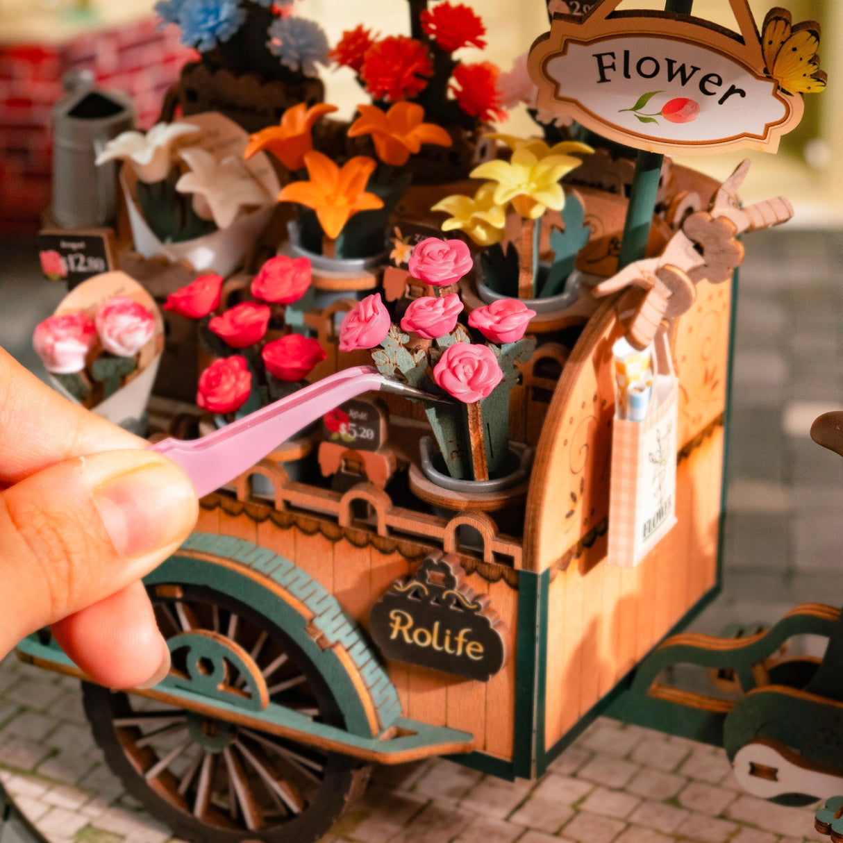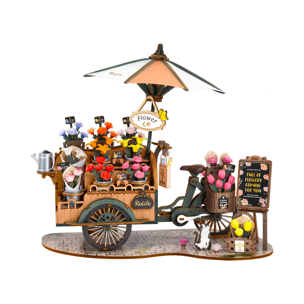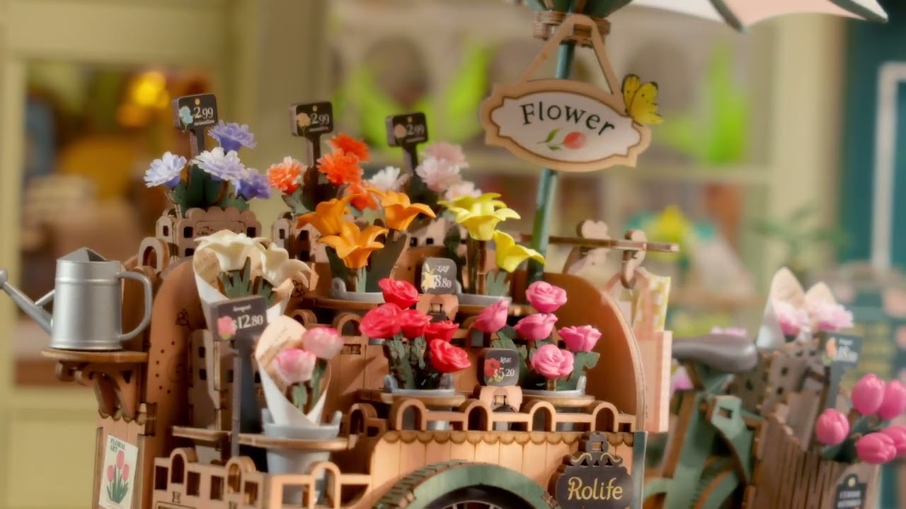 Bringe den Charme eines Blumenmarktes in dein Zuhause mit dem Blossom Cart von Rolife! Dieses detailreiche 3D-Holzpuzzle mit 187 Teilen zeigt einen nostalgischen Blumenwagen, gezogen von einem Fahrrad mit drehbaren Rädern. Ein Schirm schützt die Blüten vor der Sonne, während eine Giesskanne für Frische sorgt.