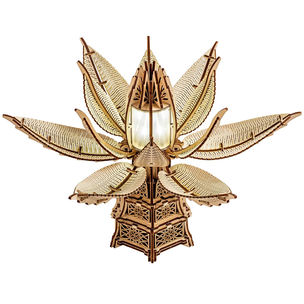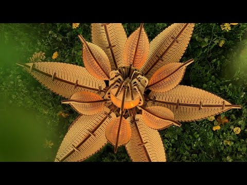 Fiery Bloom spricht in Bezug auf Schönheit wirklich für sich, aber auch ihre technischen Merkmale sind ebenso beeindruckend. Du musst 246 Holzstücke zusammenbauen, um das Projekt abzuschliessen. Die Laterne besteht aus zwei Teilen: der Blume selbst, die mit 12 Blütenblättern (6 grossen und 6 kleinen) entfaltet wird, und dem Fuss, der die Steuerung enthält. Auf dem Bedienfeld mit Ein/Aus-Tasten kannst du das Licht steuern und zwischen weissen oder gelbem Licht wählen. Das Drehen des zentralen Teils des Fusses aktiviert den Mechanismus, der die Blütenblätter öffnet.