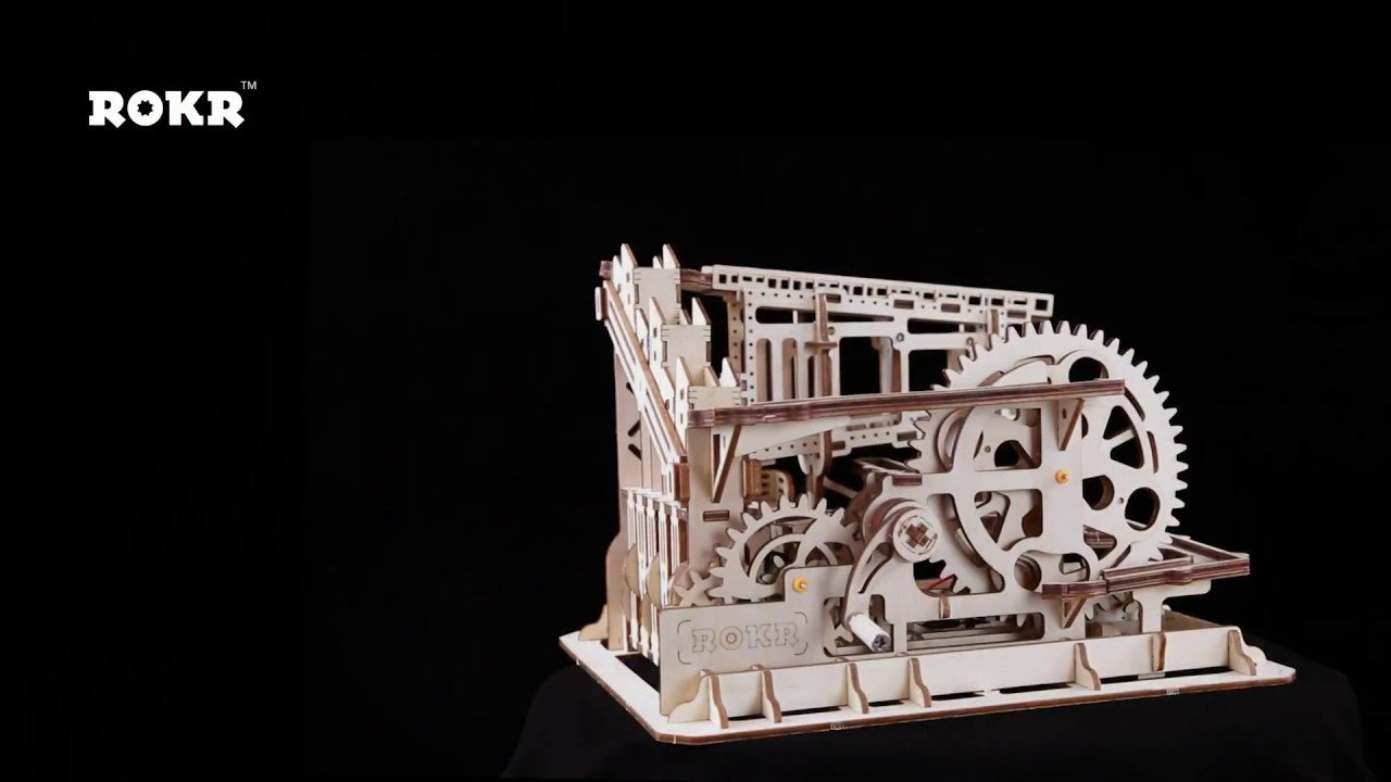 Erlebe die perfekte Kombination aus Geschicklichkeit und Ingenieurskunst mit dem Bausatz ROKR. Dieses detailreiche Modell aus lasergeschnittenem Holz bietet stundenlangen Bau- und Spielspass. Beim Zusammensetzen der 233 Teile entdeckst du raffinierte Zahnradmechanismen, die die Murmeln durch Kurven und Abfahrten befördern. Beobachte gebannt, wie die Schwerkraft und die clever konstruierten Zahnräder die Murmeln auf ihrer rasanten Fahrt antreiben!