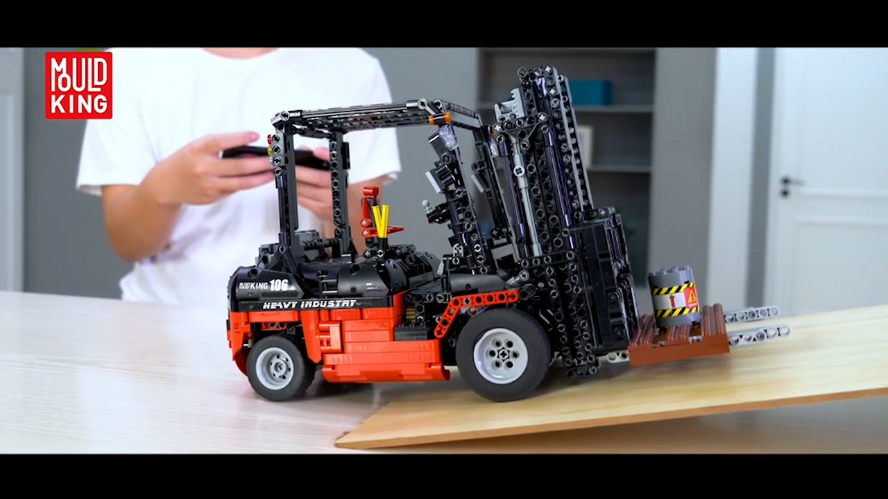 Mit diesem kraftvollen Gabelstapler von Mould King baust du dir ein voll funktionsfähiges Industrie-Fahrzeug aus 1'743 Teilen, das nicht nur realistisch aussieht, sondern auch wie ein echter Stapler funktioniert – voll ferngesteuert!