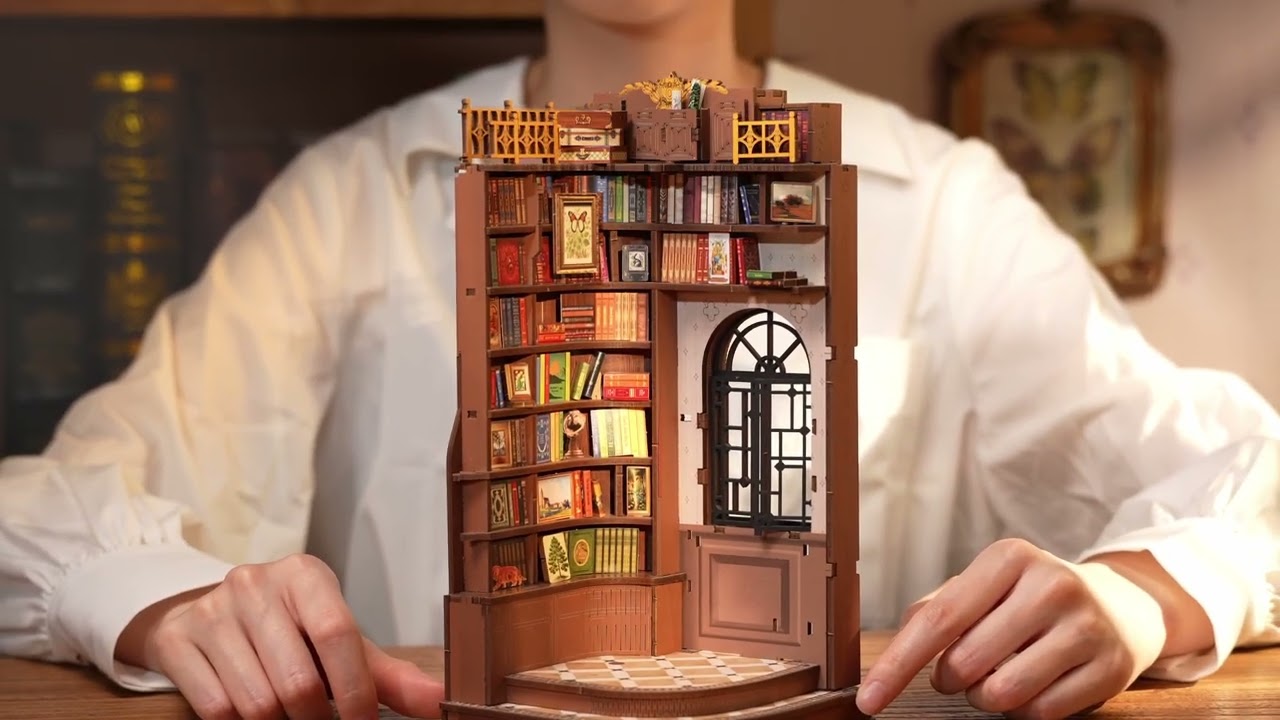 Jedes Element passt perfekt zusammen und enthüllt nach und nach die bezaubernde Szene einer gemütlichen Studierecke. Für Bücherliebhaber und Bastelfans ist dieser Book Nook ein Projekt, das Entspannung und kreative Erfüllung vereint.