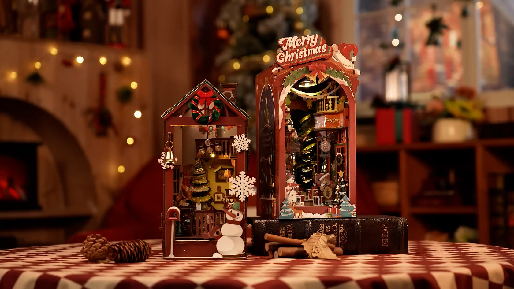 Erlebe die gemütliche Magie des Weihnachtsabends mit dem DIY Book Nook Christmas Indoor Scene von Rolife. Dieses Modell zeigt ein festlich dekoriertes Wohnzimmer mit liebevollen Details: Ein prachtvoll geschmückter Weihnachtsbaum steht in der Ecke, während ein warmes Kaminfeuer für eine behagliche Atmosphäre sorgt. Ein niedliches Hündchen hat seinen Platz vor dem Kamin gefunden und rundet die Szenerie perfekt ab.
