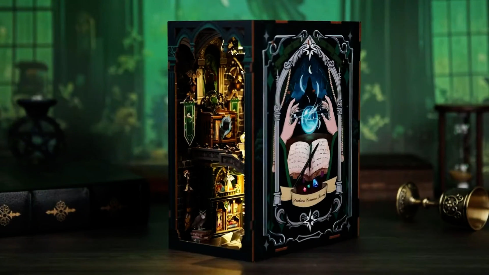Tauche ein in die düstere und magische Welt des Darkness Common Room. Dieses detailverliebte Book Nook entführt dich in einen geheimnisvolle Raum voller magischer Energie. Öffne die massiven Steintüren und entdecke einen geheimen Raum, in dem Lichtstrahlen die farbenfrohen Fläschchen auf dem Zaubertisch erleuchten – jedes mit scheinbar unendlicher Magie gefüllt.