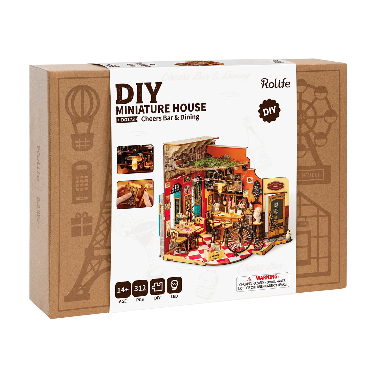 Das Rolife Cheers Bar & Dining Diorama lädt dich zu einem stilvollen Abend im Miniaturformat ein. Dieses detailreiche DIY-Holzpuzzle mit 312 Teilen zeigt eine elegante europäische Bistro-Szene mit gemütlicher Bar, Weinregal, Vintage-Dekor und charmanten Details wie Speisetafeln und Retro-Postern. Perfekt für alle, die den nostalgischen Charme klassischer Bars lieben und Freude am Basteln haben. Ein echtes Highlight für jede Sammlung oder als Geschenkidee.