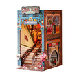 Diese Book Nook verwandelt dein Bücherregal in einen lebendigen Verkehrsknotenpunkt. Die schmalen Treppen ziehen deinen Blick magisch an und führen dich ins Geschehen. Oben erwartet dich die Strasse mit Laternen, Schildern, einem Gehbweg und beleuchteten Gebäuden.