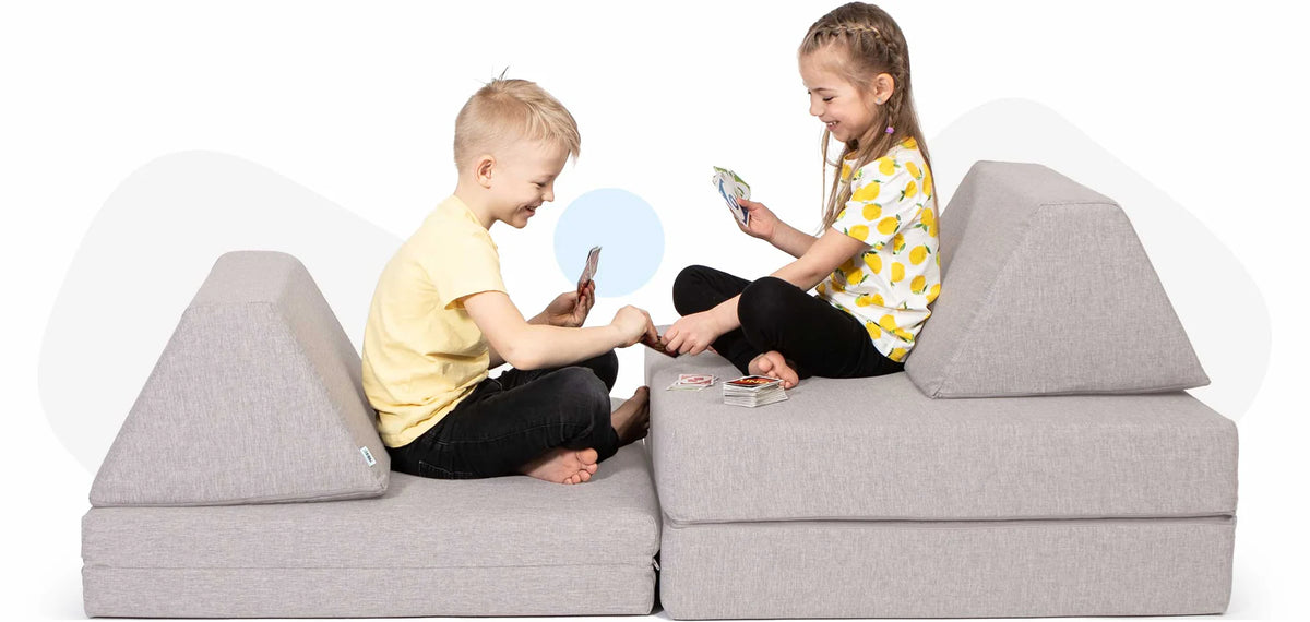 Die Spielcouch besteht aus flexiblen Schaumstoffmatratzen, die als Sofa, Spielzelt, Turnmatten, Schlafplatz für Pyjama-Party etc. verwendet werden können.